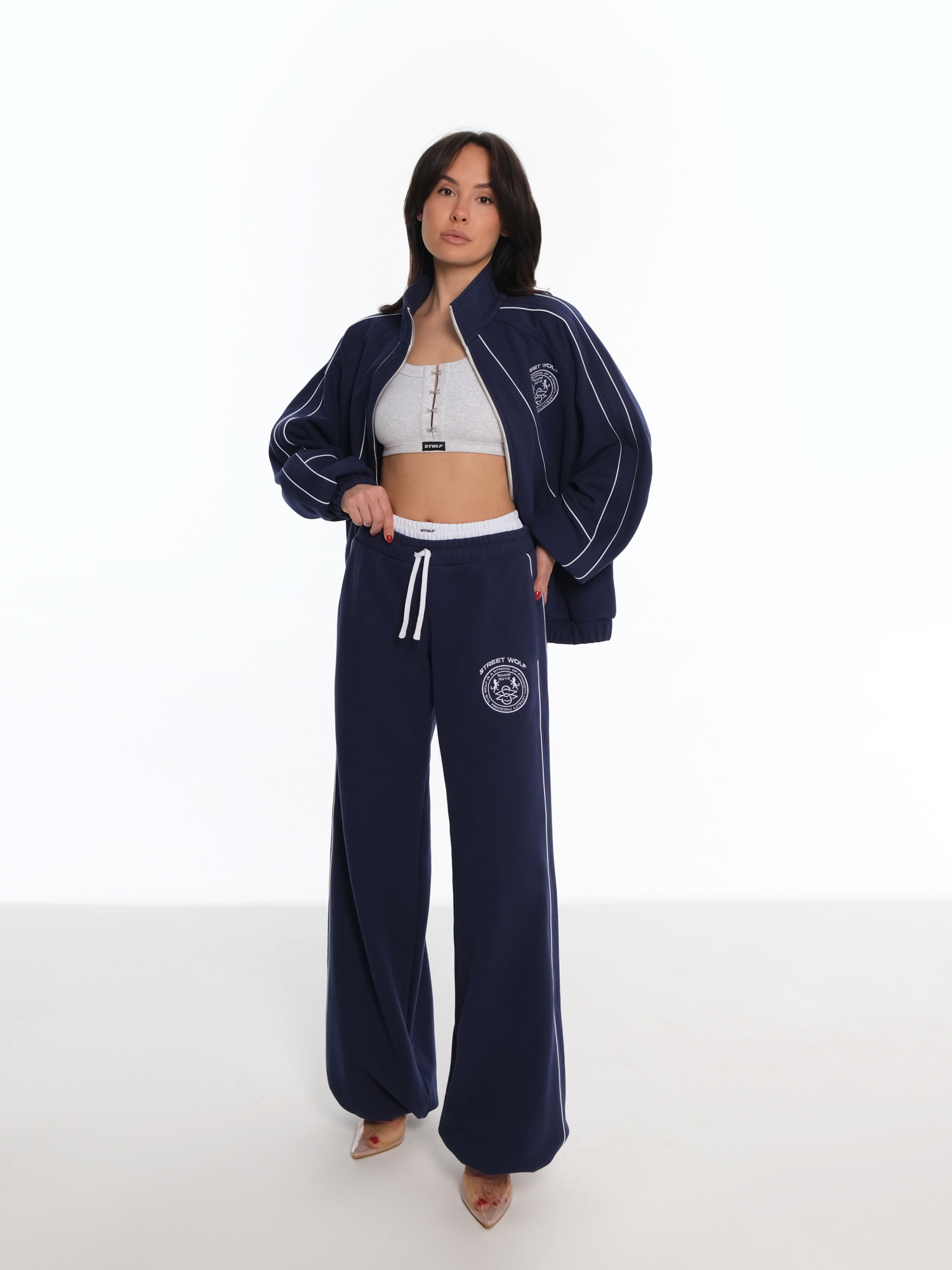 Эмблема - костюм с дерзким характером, объёмная толстовка и брюки с двойным поясом, дополненные кантом и вышивкой эмблемы бренда.