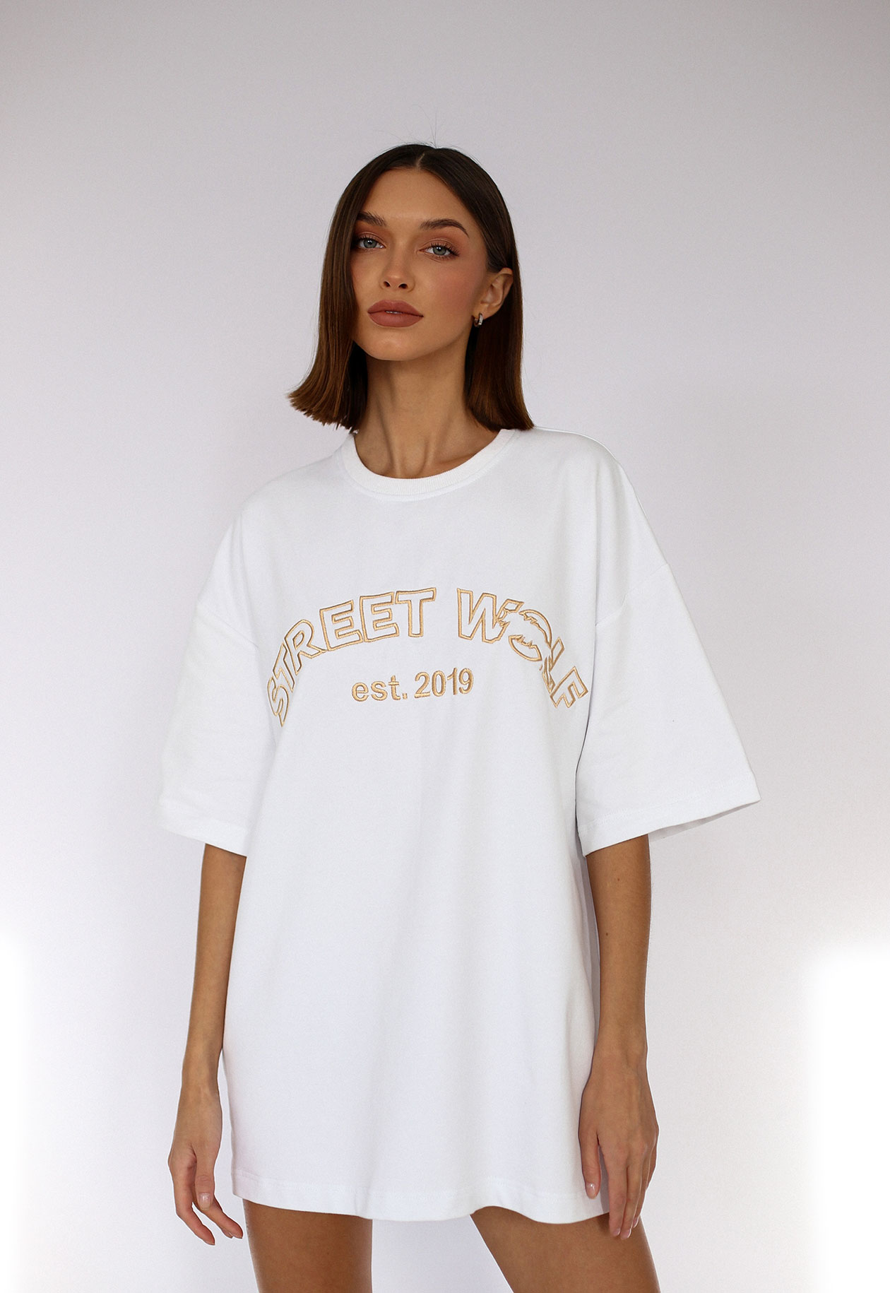 Белая футболка оверсайз свободного покроя, спущенное плечо, широкие рукава длиной до локтя. По линии круглой горловины – рельефный шов. На полочке крупно выполнена брендированная вышивка золотистого цвета Street Wolf, на спинке – располагается вышивка Wolf.