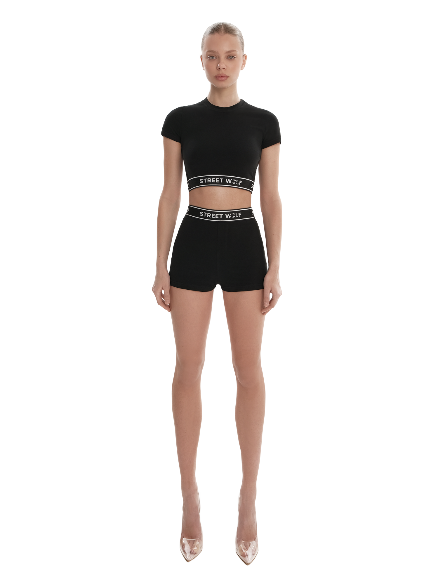 Базовая футболка черного цвета, под грудью – широкая эластичная резинка. Комплект изготовлен из натуральной хлопковой кулирки с эффектом велюра. Пояс выделен резинкой и оформлен фирменной вышивкой STREET WOLF.