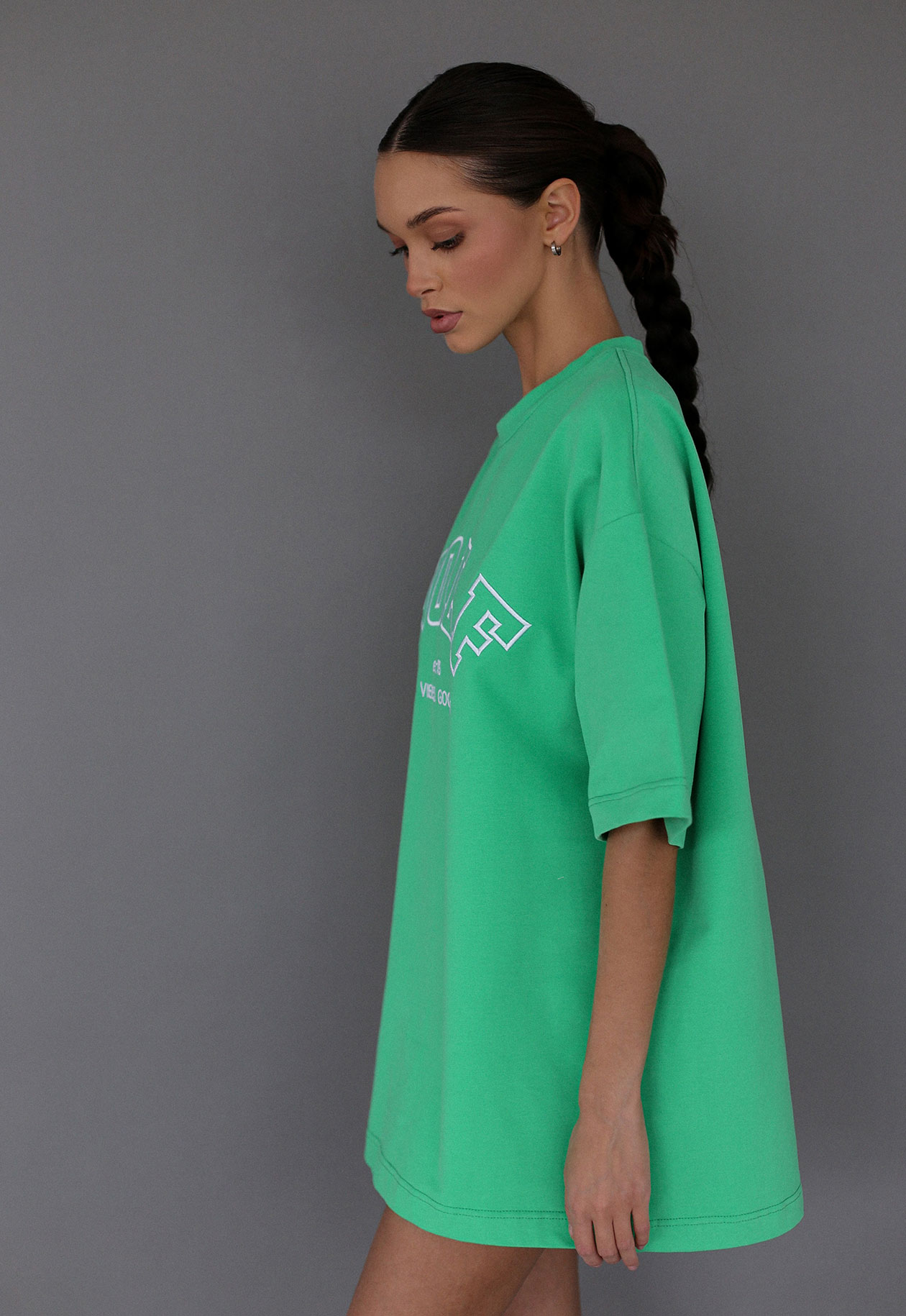 Базовая ярко-зелёная футболка свободного силуэта, длиной ниже линии бёдер. Спущенное плечо, широкие рукава, и рельефные швы – вокруг горловины и по нижней части рукавов. В верхней части спинки и на полочке – брендированная вышивка Wolf.
