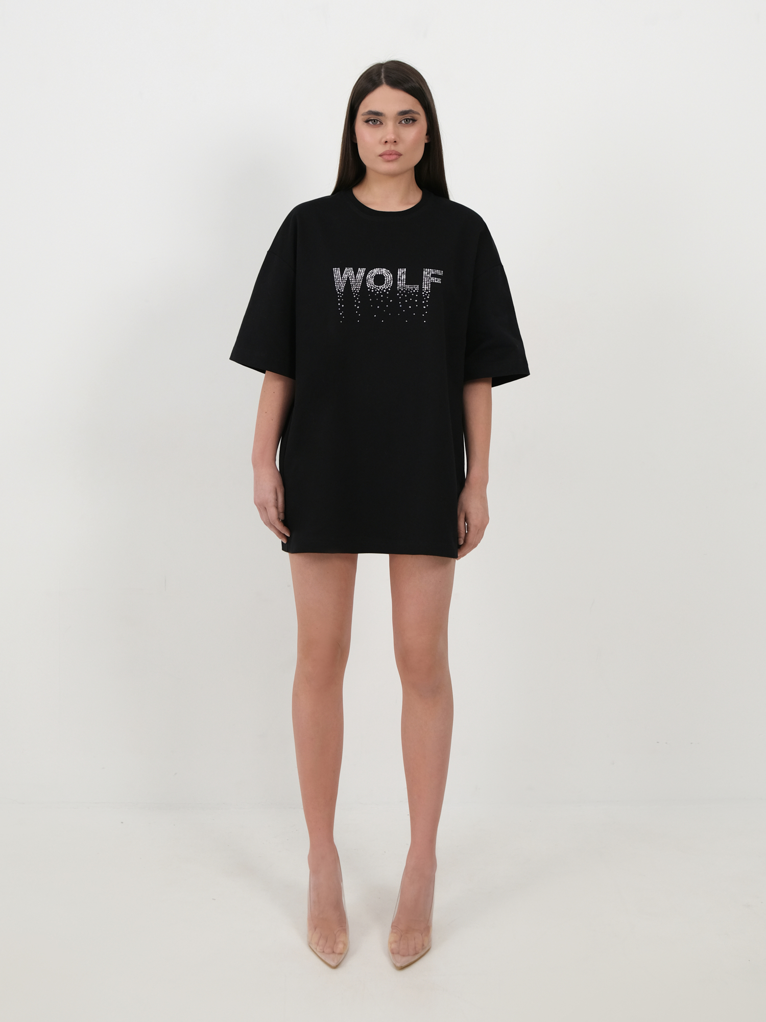 Фирменная футболка - логотип WOLF, выложенный сияющими стразами, создаёт эффект падающего снега.
