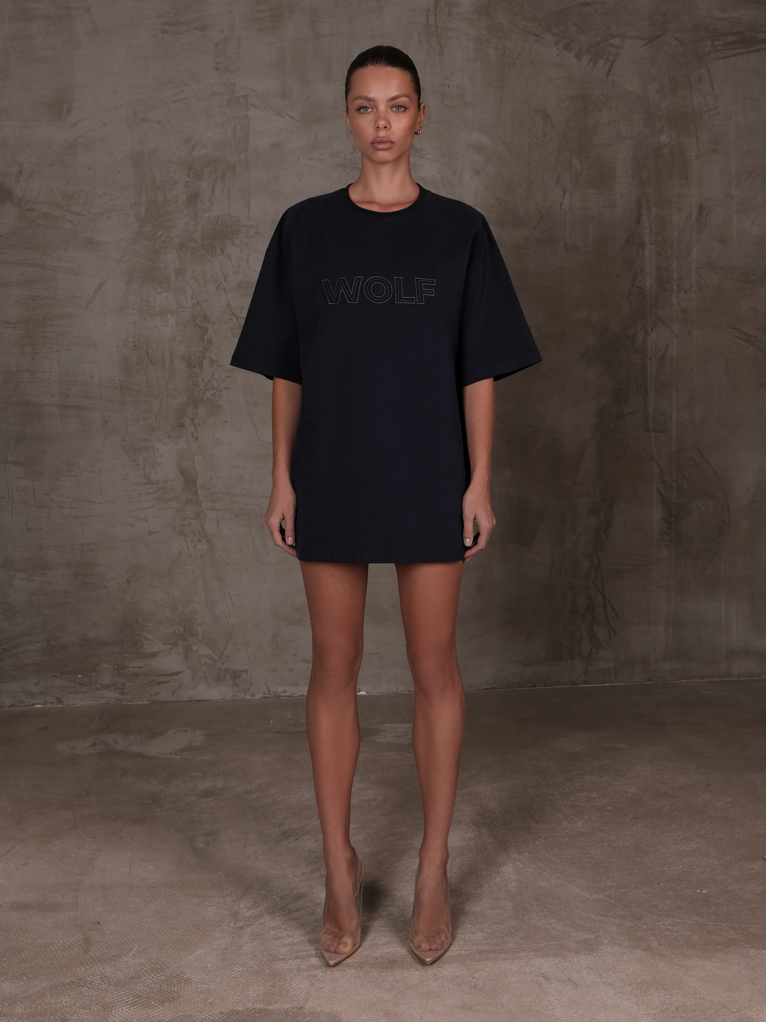 На полочке и спинке футболки брендированная вышивка WOLF.
