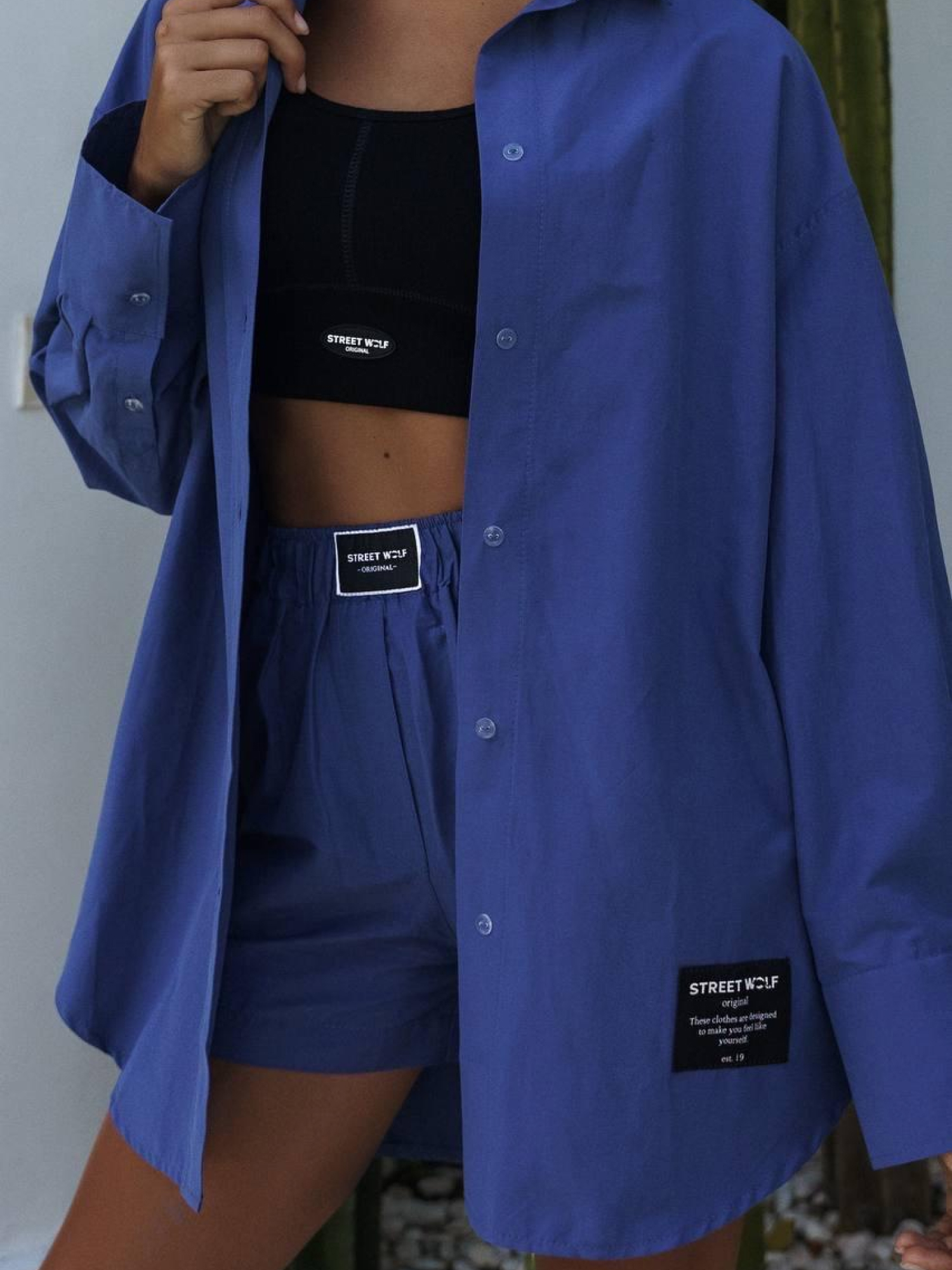 Женские шорты из хлопка в синем цвете. Пояс - эластичная резинка, по бокам - прорезные карманы и разрезы в нижней части изделия. На резинке выполнен лейбл с брендированной нашивкой Street Wolf.