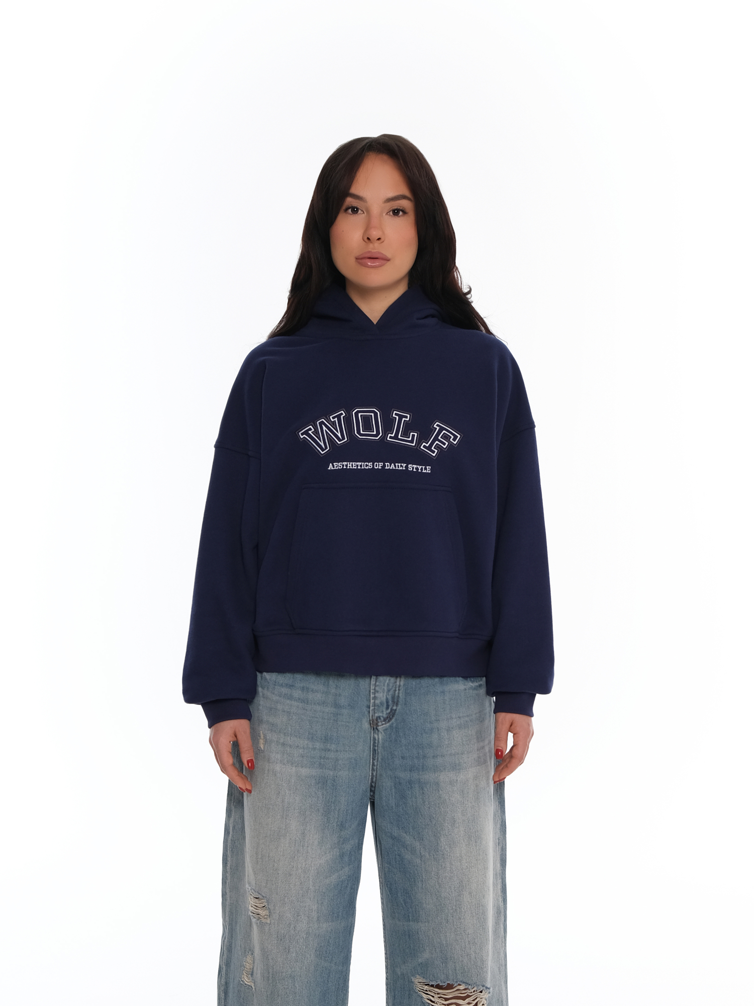Худи в умеренном оверсайз силуэте с выверенным кроем, который красиво садится по фигуре и сохраняет баланс между комфортом и аккуратностью. Глубокий синий оттенок выглядит благородно и легко сочетается с базовым гардеробом, а фирменная вышивка добавляет акцент и узнаваемость.