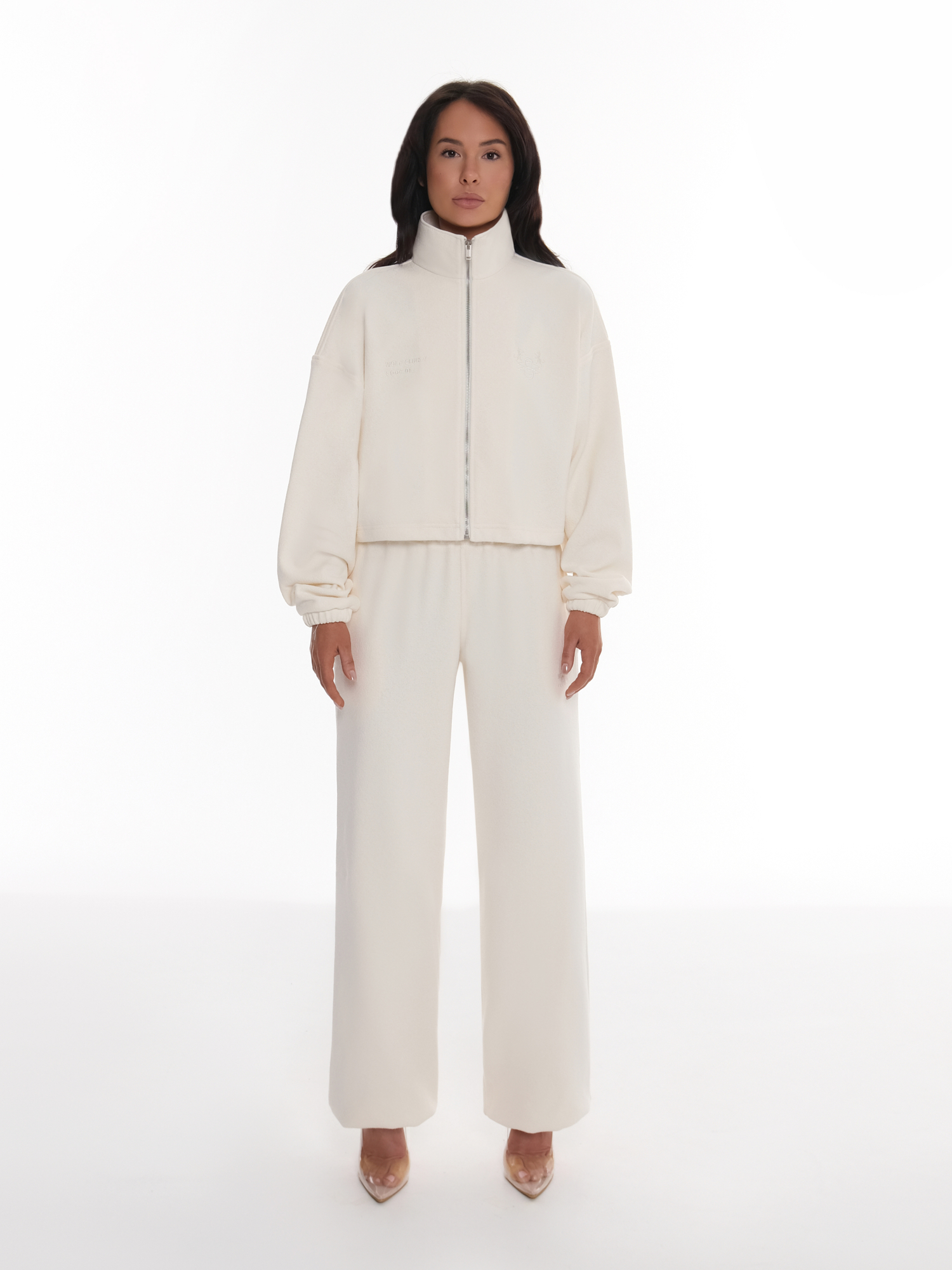 Этот женский костюм выполнен в благородном цвете экрю, который дарит образу мягкость и естественную элегантность. Текстура ткани создает объем и неповторимый уют, визуально напоминая дорогой трикотаж, , но при этом сохраняет легкость и практичность современных материалов. В комплект входят:· Свободная толстовка на молнии: Удобная застежка-молния позволяет регулировать степень открытости. Низ толстовки собран на стильную кулиску, благодаря которой вы можете менять силуэт, делая его как прямым, так и более собранным и женственным.· Спортивные брюки прямого кроя: Идеально дополняют верх, создавая гармоничный комплект. Этот костюм станет вашим любимым вариантом для прогулок и встреч с друзьями .