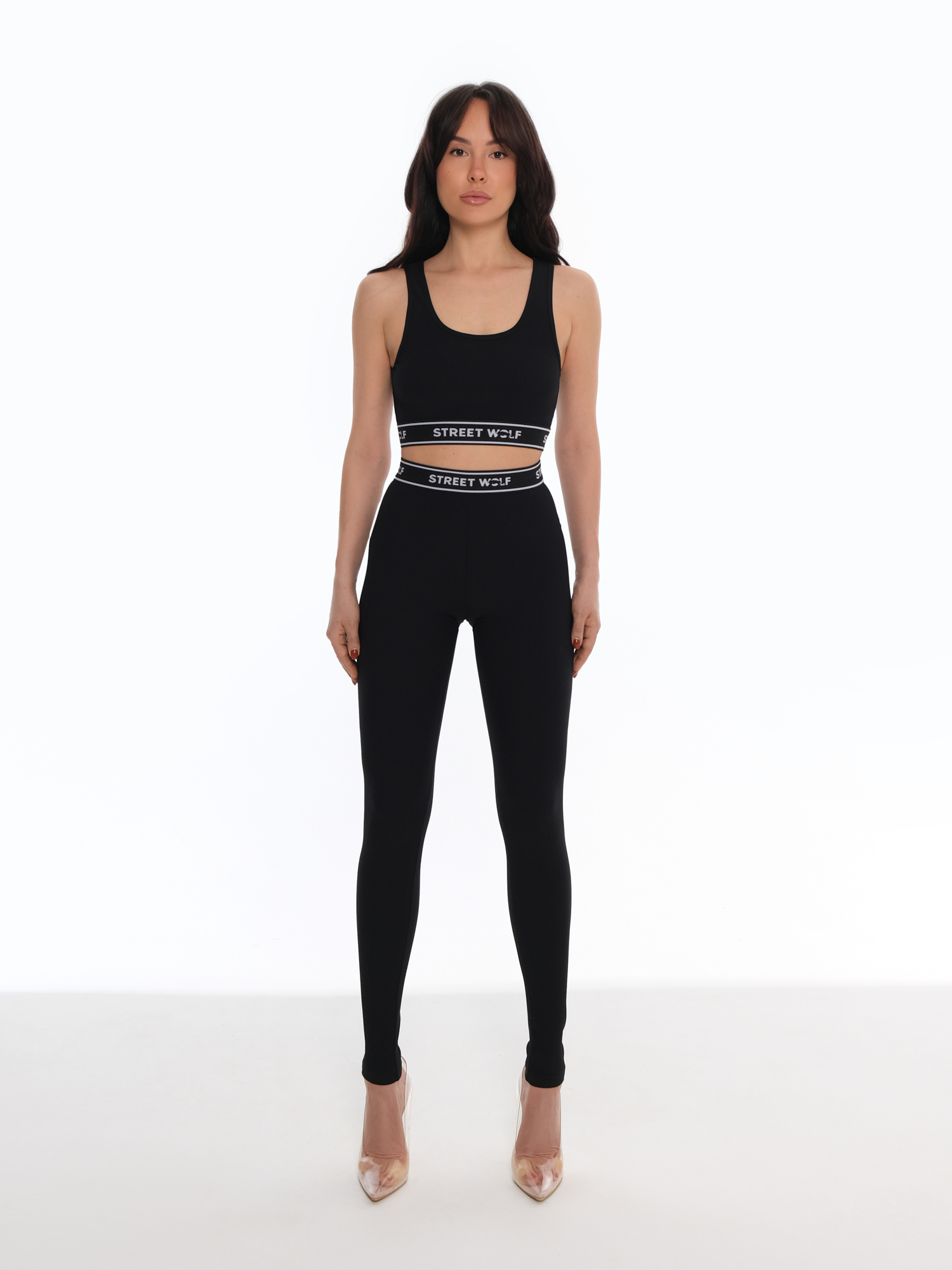 Стильный чёрный комплект из рибаны (топ + лосины) создан для активных тренировок и повседневного комфорта.