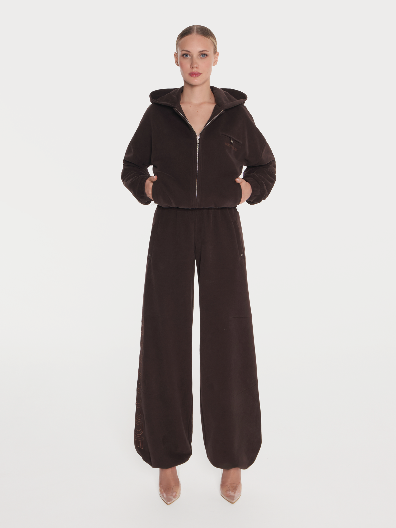 Современный силуэт и продуманные детали. Широкие брюки с кулиской по низу позволяют регулировать посадку и создавать разные образы — от расслабленного до более собранного. Акцентная вышивка на штанине добавляет характер и делает образ узнаваемым.