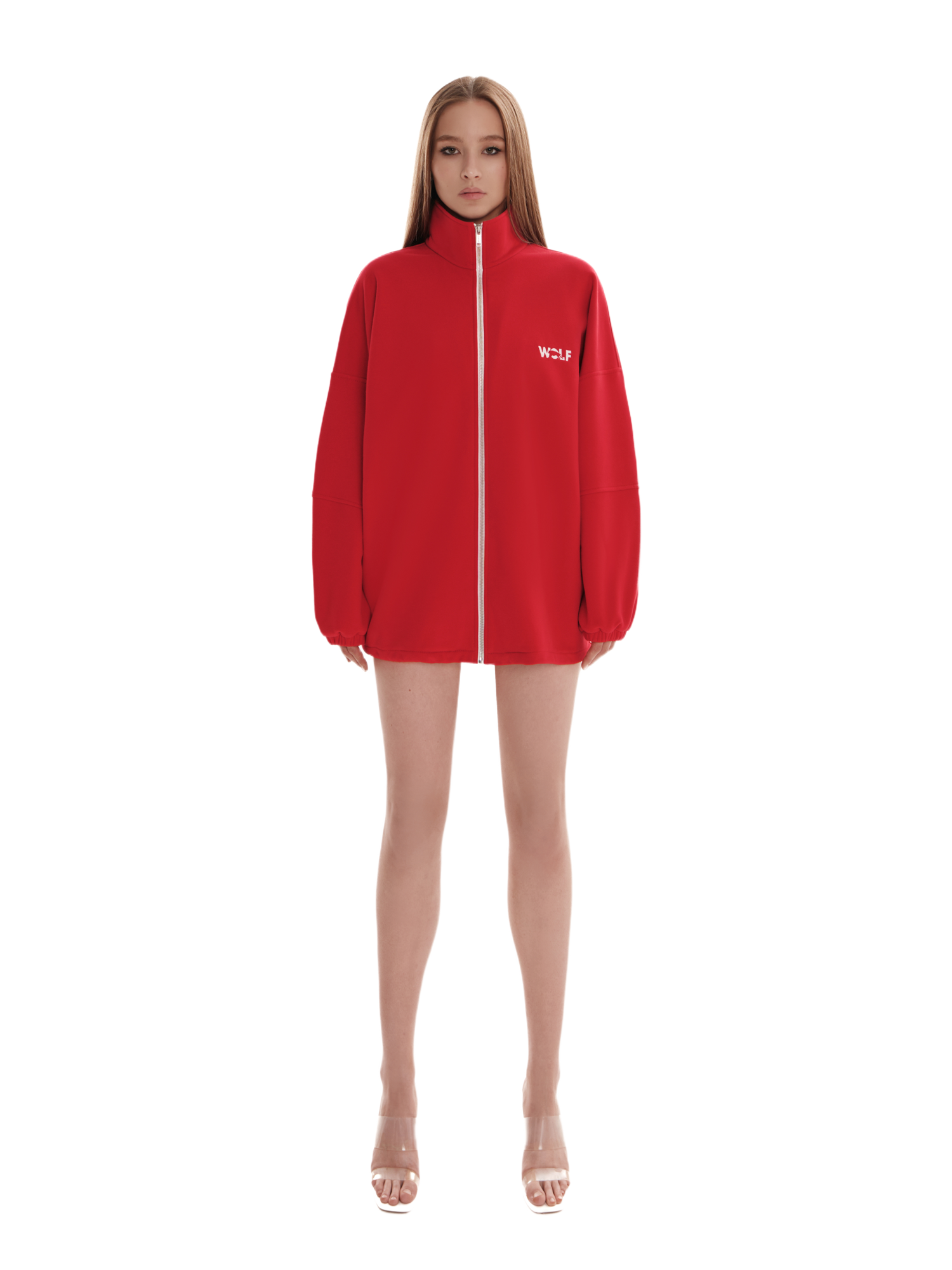 Толстовка выполнена из футера с начесом с высоким воротом, низ изделия – на кулиске, застёгивается на молнию.
