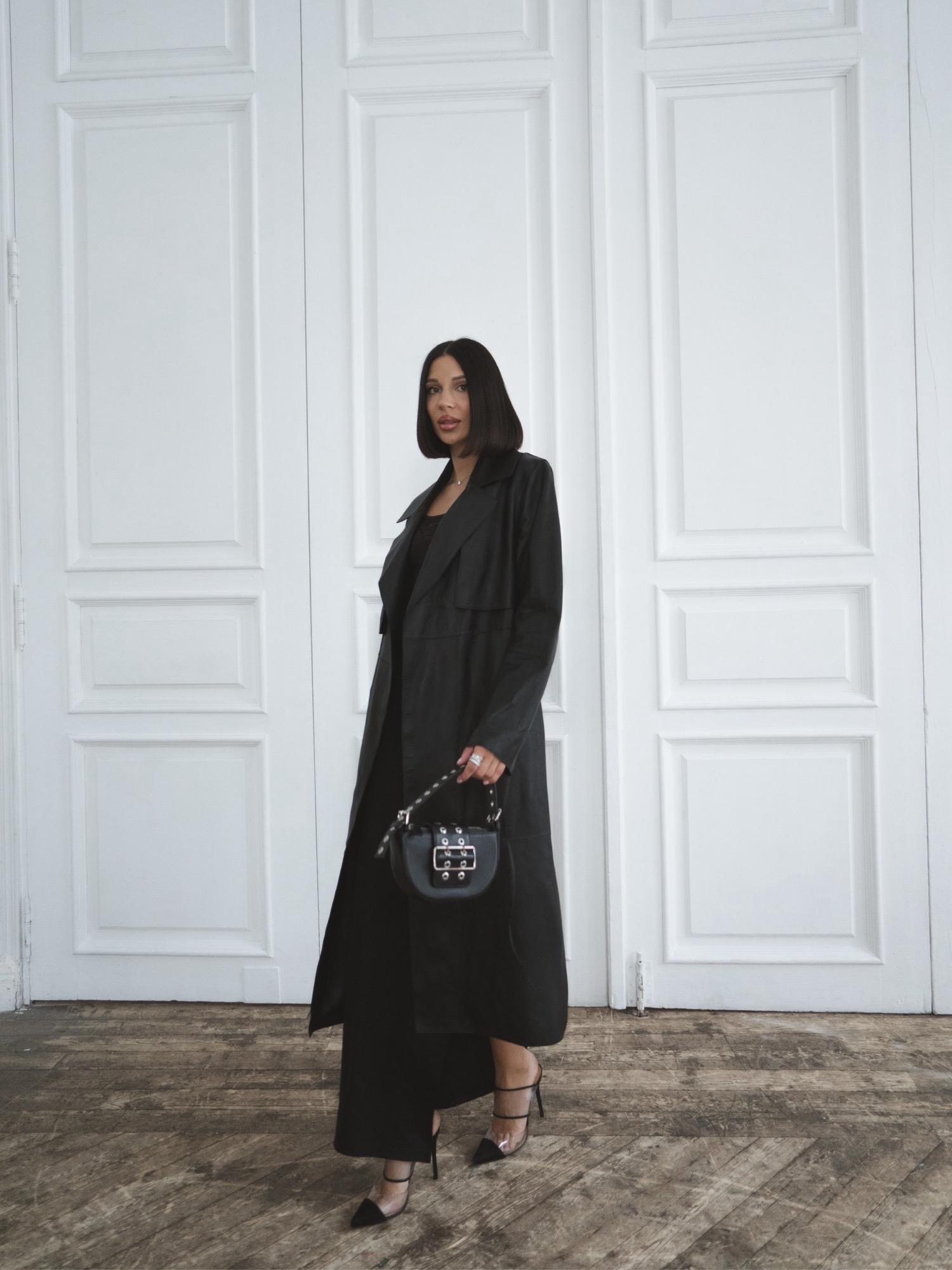 Тренч чёрного цвета длиной до середины икры. Отложной воротник, отвороты образуют глубокое декольте. По линии талии – шлёвки, пояс из кожи завязывается на продёрнутые кожаные шнурки. На полочках – вертикальные прорезные карманы «в рамку». Изделие выполнено из натуральной телячьей кожи в чёрном цвете.